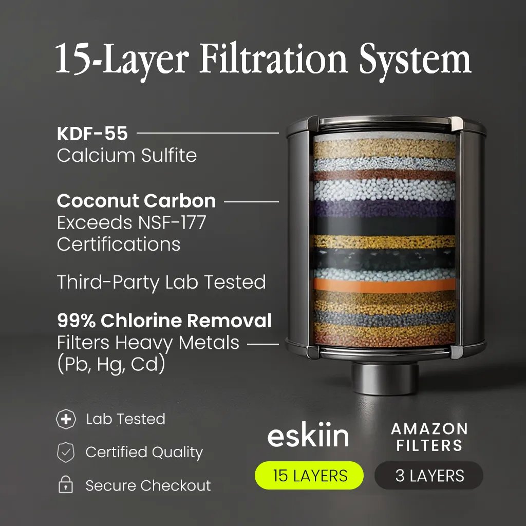 Advanced 15-layer filtration removes 98.7% of chlorine, heavy metals, and bacteria that trigger eczema, rosacea, dermatitis, and other inflammatory skin conditions.